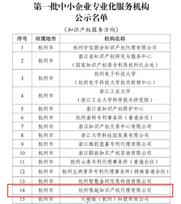 喜報??!關于杭州惟越知識產(chǎn)權(quán)代理有限公司入選浙江省首批中小企業(yè)專業(yè)化服務機構(gòu)的公示